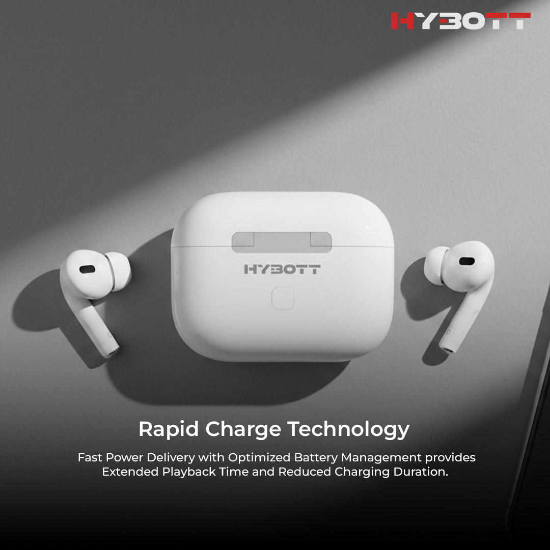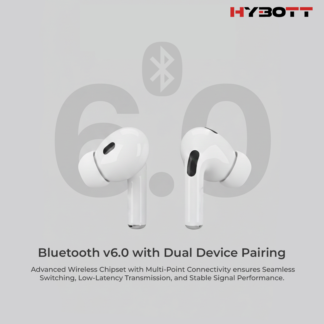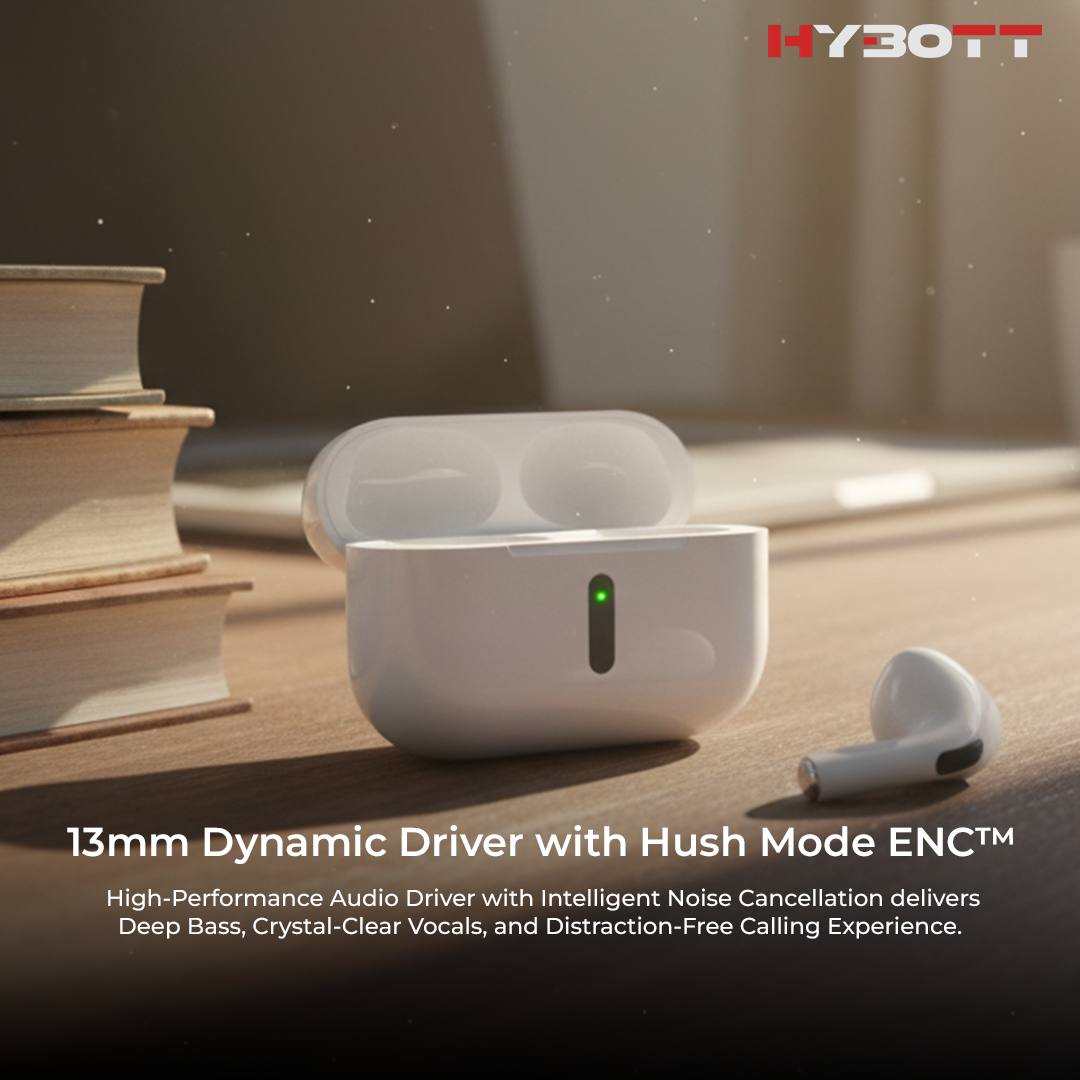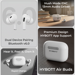 Experience true wireless freedom and crystal-clear calls with the HYBOTT Air Buds, featuring Hush Mode ENC and quad mic technology for impeccable sound clarity and noise cancellation.